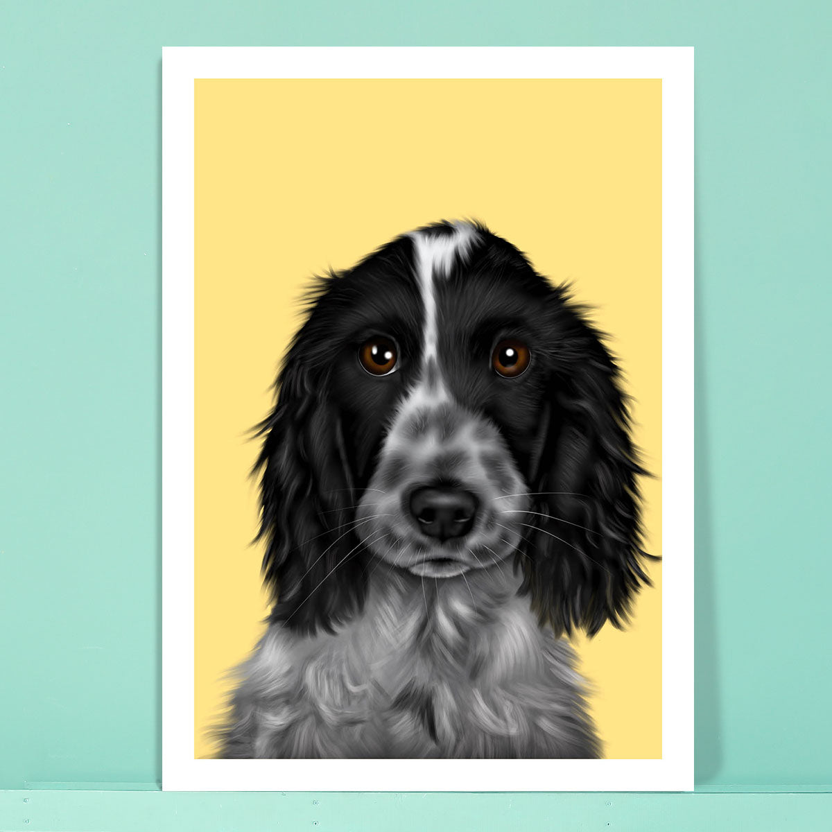 Cute and bright Blue Roan Cocker Spaniel greetings card. Great for any occasion.