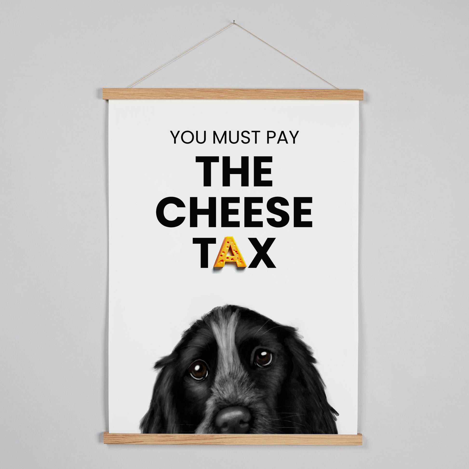 Show off your love for Cocker Spaniels with this playful "Cheese Tax" art print. Perfect for any kitchen, this print reminds you not to forget to pay the cheese tax to your furry friend. A must-have for any Cocker Spaniel owner.