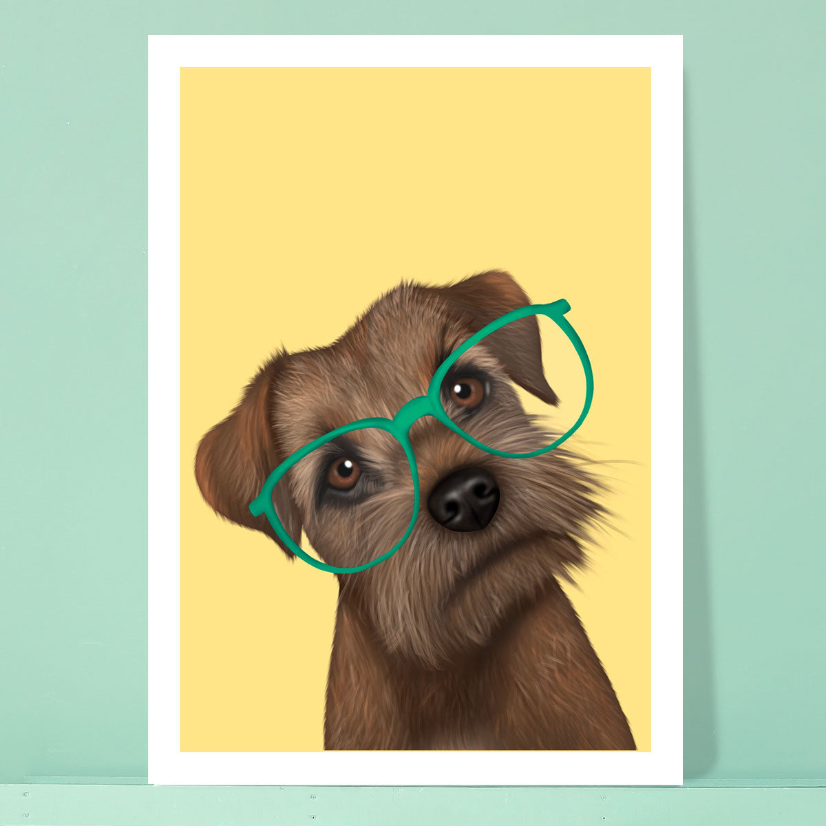 Cute, bright and fun Border Terrier wearing glasses and headphones greeting card. Great for any occasion.