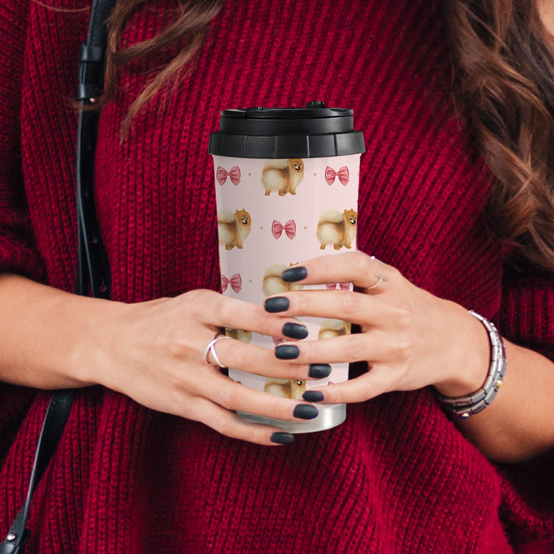 Carry your hot drinks in style with this Pomeranian and Bows Pattern Travel Mug. Inspired by Kate Beckinsale and her beloved Pom MYF, this mug is fun and functional. Perfect for daily use or as a gift for any dog lover. Keep your drinks hot and your style on point!